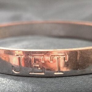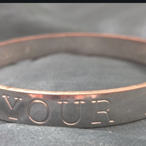 Kate Spade silver bangle with 'On your mark, Get jet set, Go!' engraved. minor tarnish (not as much as my lousy light appears except on the inside).