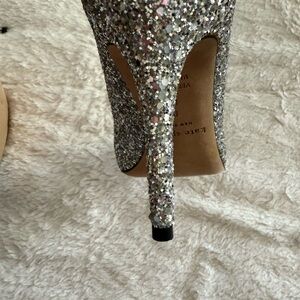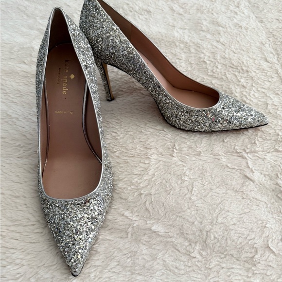 Elevate any outfit with these stunning Kate Spade silver glitter pumps. Featuring a classic pointed toe and sleek stiletto heel, these shoes add instant sparkle—perfect for weddings, parties, holidays, or special events.