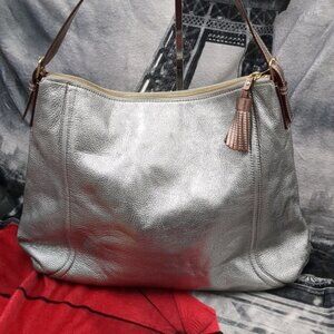 Large leather silver purse with copper strap. Inside is clean. Dimensions are 12 in deep 18 in across at the widest part.