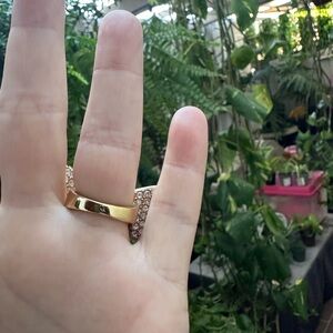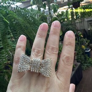 Gold bow ring adorned with sparkling rhinestones. Perfect for adding a touch of glamour to any going out top! Size 6