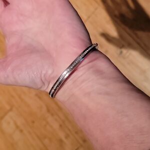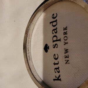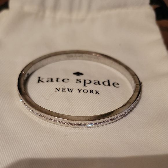 Chic silver bracelet by Kate Spade. Features a sleek design with shimmering accents. This has a good clasp on it that you just push down on so you can put it on or off without help silvertoned with crystals all over I wear a size 7 It comes with its dust bag