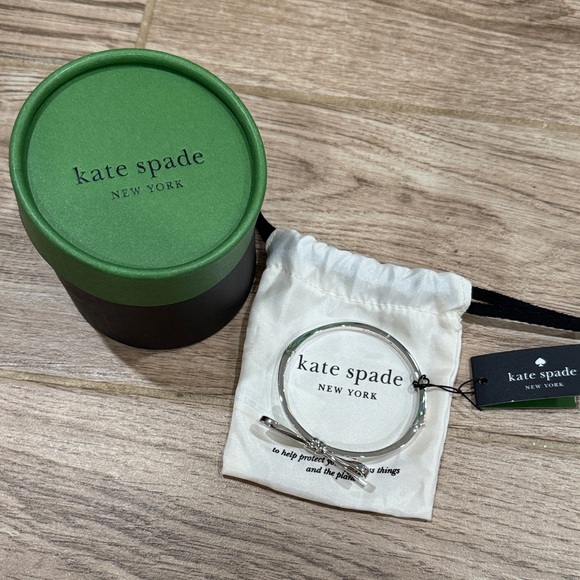 Chic silver tone bow bracelet by Kate Spade. Includes branded green box and pouch.