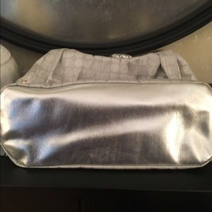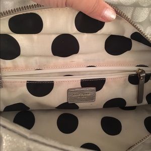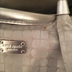Used silver Kate Spade handbag. Small marks on front and zippers. But overall in great condition. Comes with dust cover.