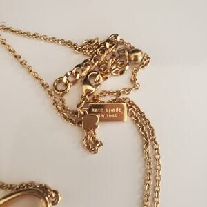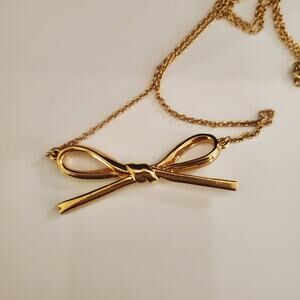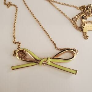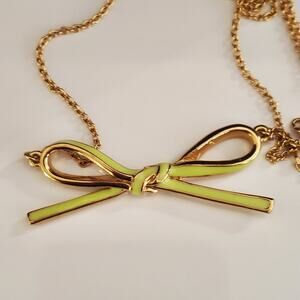 Kate Spade Skinny Mini Bow Necklace is lime green on a gold plated base. Chain adjusts from 27 to 29 inches long and the pendant is 1 1/2 inch across. Very good condition.