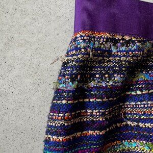 Vibrant and chic Kate Spade tweed pencil skirt featuring a mix of jewel-tone threads woven with subtle metallic shimmer. Finished with a signature purple grosgrain waistband and gold back zipper for a polished, feminine finish.