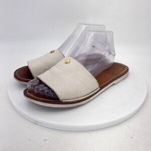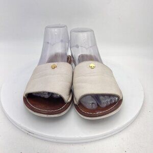 Elegant cream slide sandals. Features a simple design with a gold accent. Perfect for casual wear.