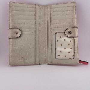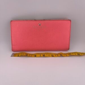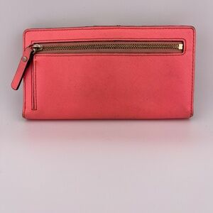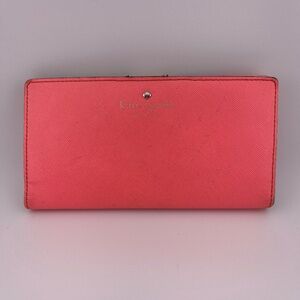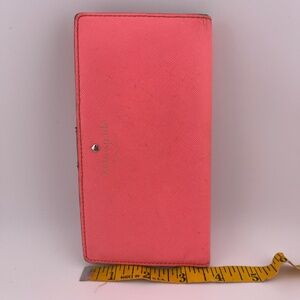 Kate Spade Slim Wallet in a vibrant coral color! Some minor wear on corners as noted in photos. Slight discoloration from coins in exterior pocket from normal use.