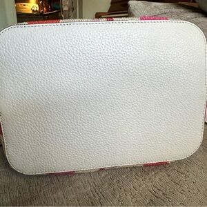 Known mostly as a leather purse, this is the standout of the collection I believe. With white pebbled leather, gold embossed logo, silver hardware, and beautiful coastal looking pink and neutral stripes on canvas. Everybody that sees this bag loves it. I think it looks like a piece of bubblegum. It’s yummy.
