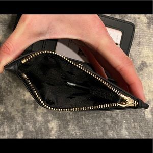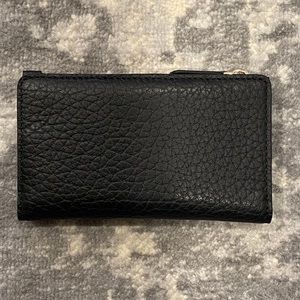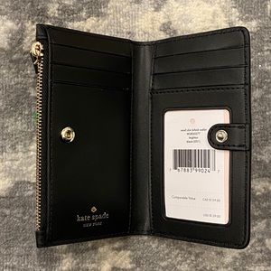 NWT Kate Spade Leighton bifold wallet in black pebbled leather. Snap closure with multiple card slots, ID window, billfold compartments, and zip pocket on the exterior. Overall dimensions are approximately 5.5”x3.25”. Price is firm.