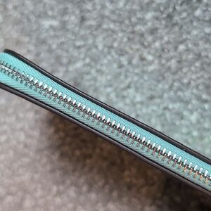 Color is Seawater. Described as a metallic mint green. Silver zipper and hardware.