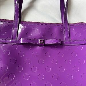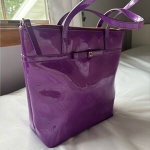 This never used before luxurious Kate Spade tote bag in a vibrant purple hue features a high-gloss finish and a structured rectangular design. Its double handles and top closure make it both stylish and functional, perfect for adding a bold statement to any ensemble. No creases, stains, or any signs of usage.