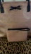 Elegant glitter tote with matching wristlet. Features black handles and bow detail. Perfect for stylish outings.