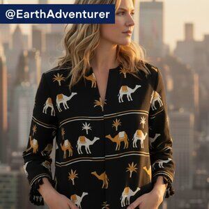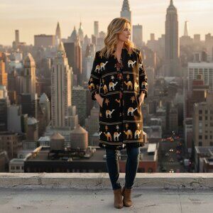 Stylish women's coat featuring a unique camel print in black and orange. Perfect for adding a touch of flair to your wardrobe.