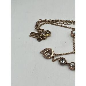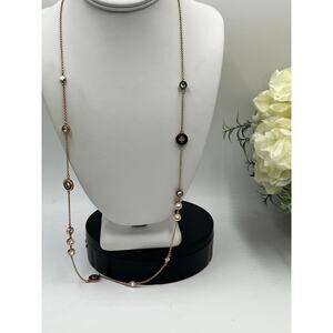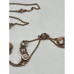 This is a Kate Spade New York necklace featuring a rose gold tone metal with bezel set rhinestone stations and the brand's spade logo. The necklace has a 36-inch length to the end of the extender and is signed by the brand. It has a lobster closure and is designed with round crystal rhinestones. The style is a station necklace, and it is not antique or vintage.