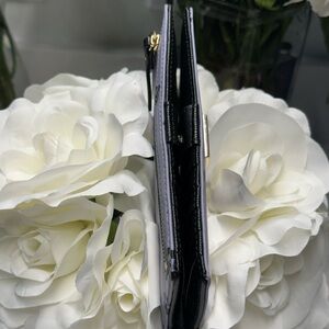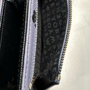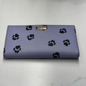 Stylish Kate Spade wallet. Features purple base with black paw prints. Elegant and chic design.