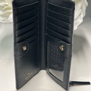 Snap closure wallet has 12 card slots, 1 ID window slot, 4 bill slots.