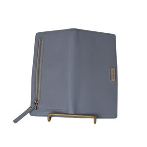 Kate Spade New York Stacy bifold wallet in a soft powder blue hue. Crafted from durable Saffiano leather with signature gold Kate Spade logo on the front and a zip coin pocket on the back. Compact yet spacious — perfect for daily use or gifting.