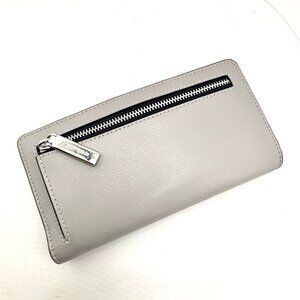 A chic, slim, and incredibly functional wallet from Kate Spade. This bifold wallet is crafted from durable two-tone Saffiano leather in shades of light and medium gray. The snap closure opens to reveal a highly organized interior with numerous card slots and an ID window, while the back features a convenient zippered pocket for coins. A perfect blend of classic style and practicality.