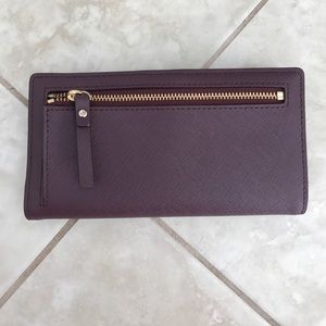 Kate Spade Stacy wallet in mulledwine. Snap closure, zippered pocket in back, 4 bill slots, 12 card slots & one id showcase slot.