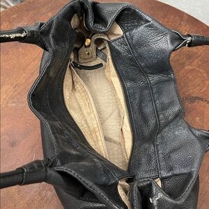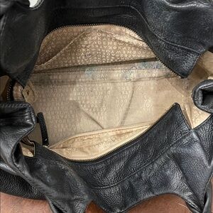 loved and well-traveled Kate Spade New York Stevie Berkshire Road satchel in black pebbled leather. This bag still has great structure and plenty of use left, but it does show wear and will need some care.