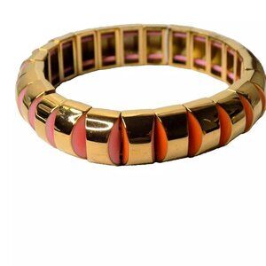 This is a kate spade new york stretch bangle bracelet in gold-tone metal with pink orange multi-color enamel sliced scallops. It is signed by the brand and features a beauty theme. The bracelet is made of mixed metals and has a stretch style, with a length of 6.5" to 7" not stretched. There is no main stone on this bracelet. Perfect for occasions such as engagements, Mother's Day, Christmas, weddings, anniversaries, birthdays, and more. Retail $68.00