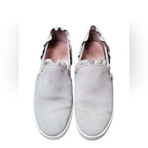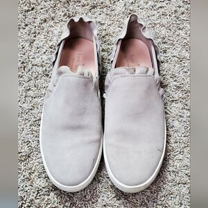 (C) Kate Spade Gray Suede Lilly Slip on Ruffle Sneakers, Size 8, a couple of scuffs, See photo's