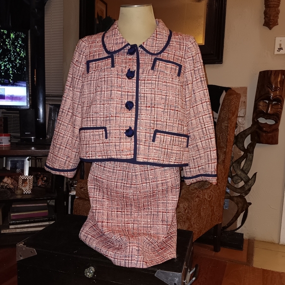 Red, White and Blue Plaid Dress Suit with Navy trim and Navy Bow Buttons