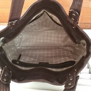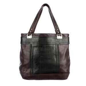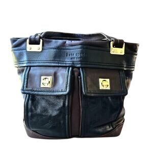 Chocolate and black leather Kate Spade New York Sullivan Street Blakely tote with gold-tone hardware, dual flat shoulder straps, dual exterior flap pockets with turn-lock closures, beige polka dot jacquard lining, three interior pockets; one with zip closure and zip closure at top.