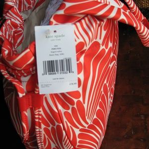 Coral red and white nylon tote bag. It’s 14” wide x 11” high with a 8.5 shoulder drop.