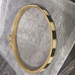 This sophisticated bracelet from Kate Spade showcases a striking black and white enamel striped design with a charming bow accent at its center. Crafted in a sleek, rigid bangle style, approx 2.75" across