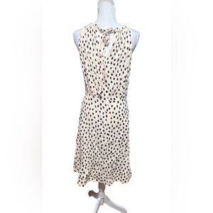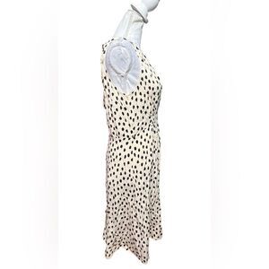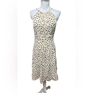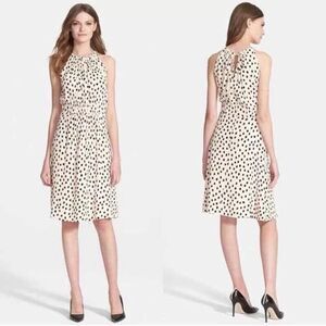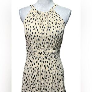 Kate Spade NY Take a Walk on the Wild Side A-line halter dress in cream and black with a blush tint featuring a dot print, lightweight, flowy fabric, tie around the neck with peek a boo opening and button closure, ruched waist, pleated, hidden back zip closure and pullover styling. In excellent pre-owned condition.