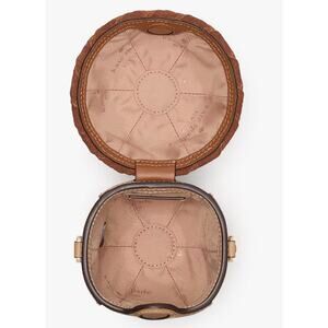 The bag is made of smooth leather with a woven suede cap and a crossbody chain strap. It features a snap closure and has the Kate Spade logo embossed on the front. The dimensions are approximately 4.3" in length, 6.3" in height, and 4.3" in width.