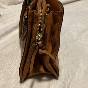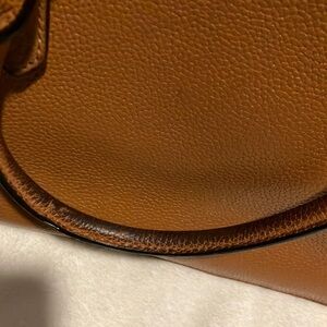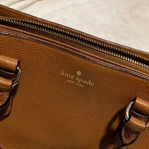 Stylish Kate Spade handbag in tan leather. Features dual handles and a sleek design.