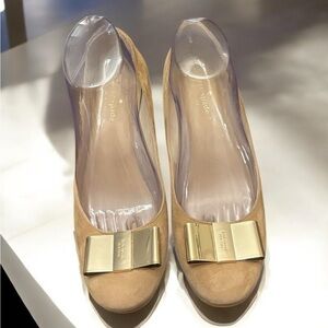These Kate Spade suede pumps feature a sophisticated tan suede-like material complemented by a striking gold metallic toe cap. The sleek, pointed toe design and classic ballet flat silhouette make them perfect for both casual and formal occasions. Heel height 2””. 25GG