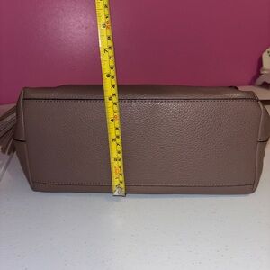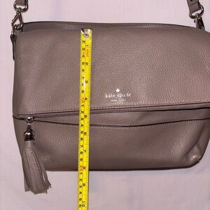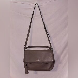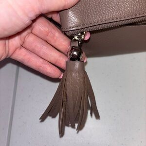 Chic taupe crossbody bag. Features adjustable strap and tassel accent. Ideal for daily wear.