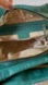 Elegant teal leather handbag with a spacious interior. Perfect for everyday use or special occasions. Used condition with a tear that was mended (shown in last picture). Measures approximately 8”x14”x5”. Tons of storage!