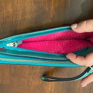 All in one wallet. Made to carry everything in one place - Wallet, phone, keys! Pocket specific for phone, multiple compartments and zippered pockets! Tons of space for travel items, cards, cash ect!! Perfect for a new mom needing something easy, perfect for student, travel! Beautiful turquoise Leather. EUC