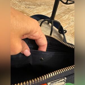 This Kate Spade shoulder bag is a stylish addition to any outfit. The exterior is made of durable polyester nylon and features a beautiful floral pattern with a background of blue.