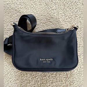 Stylish black crossbody bag by Kate Spade. Features gold hardware and detachable strap. Worn but good condition. Slight stain by the buckle as pictured, but it is barely noticeable
