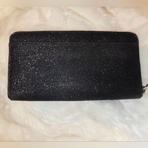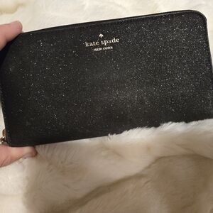Kate Spade Tinsel Glitter Continental Full Zip Wallet. I tried to get a good photo but there is a spot where I tried to spot clean the outside of the wallet after it got some water spilled on it. A small amount of the glitter looks discolored now in that area. I priced the wallet to reflect the damage. I only used this one time.