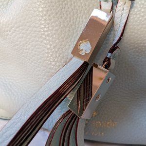 Pebbled cowhide soft leather. Gold toned hardware detail on tassels, long adjustable strap, interior slide pocket. Signature lining. Gold foil printed Kate Spade New York logo on front.