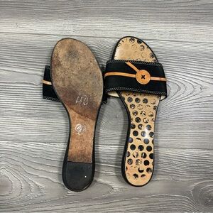 Ships fast from North Carolina! Unique Kate Spade black flat sandals with retro polka dot soles, wide canvas strap, and leather button detail. Chic yet playful—perfect for summer events, city strolls, and brunches. Made in Italy, with wear on footbeds but in great overall condition.