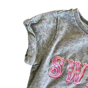 Kate Spade gray short sleeve tee with sweet pink text to chest. Size listed as 4 years but in my opinion would best fit around 2T. Measures 14" long, underarm to underarm 10 1/2" (L4317)