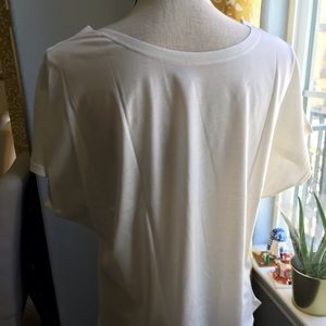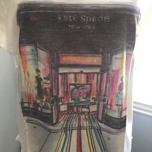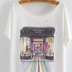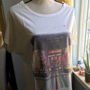 Super soft wide neck top with print of Kate Spade bag store front. Great way to show your love for the iconic brand.