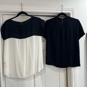 They are both in a crepe like fabric and in very good condition. The black and white top fits more boxy and is a size 00.