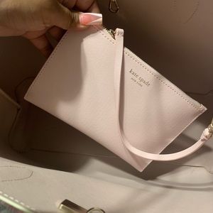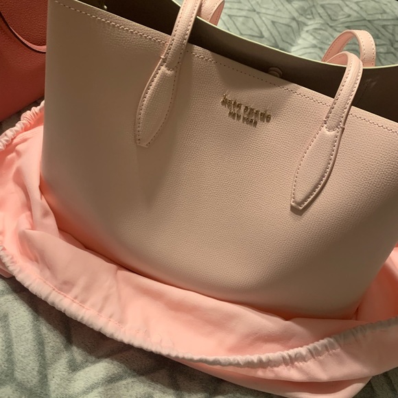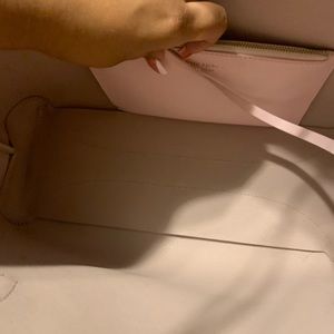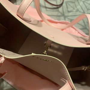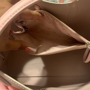 Brand New, rarely used, clean smoke free home, no stains or marks, spacious purse, comes with small wallet attached and comes with the pink sac.