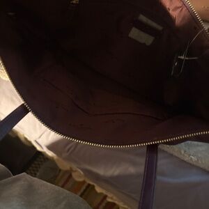 • Interior: Matching plum lining with the Kate Spade logo print, featuring a zip pocket and slip pockets for organization.