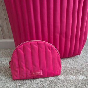 This is a Kate Spade New York tote bag and matching cosmetic bag set. The tote bag featuring a quilted design with horizontal stitching. It has two shoulder straps and a small Kate Spade logo tag. The cosmetic bag is a half-moon shape with a zipper closure and matching quilted design. Both items are made of a bright pink material and are in new condition without tags or box.