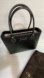 Black Leather with gold hardware, flat bottom with 4 gold feet, double shoulder straps with 7” handle drop, open interior with center zipper pocket and side pockets