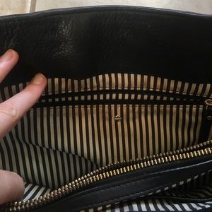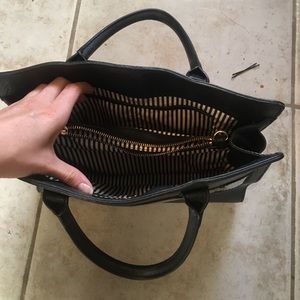 This black bag goes perfect with everything! It has been lightly used however the leather is soft and blemish-free, as you can see in the photos. The inside lining is in great condition; there are no tears or rips. In the pictures, you can see the discoloration however, in the white part of the fabric. The handles are immaculate and the bottom is free of stains, rips, or blemishes. The bag really is in great condition!